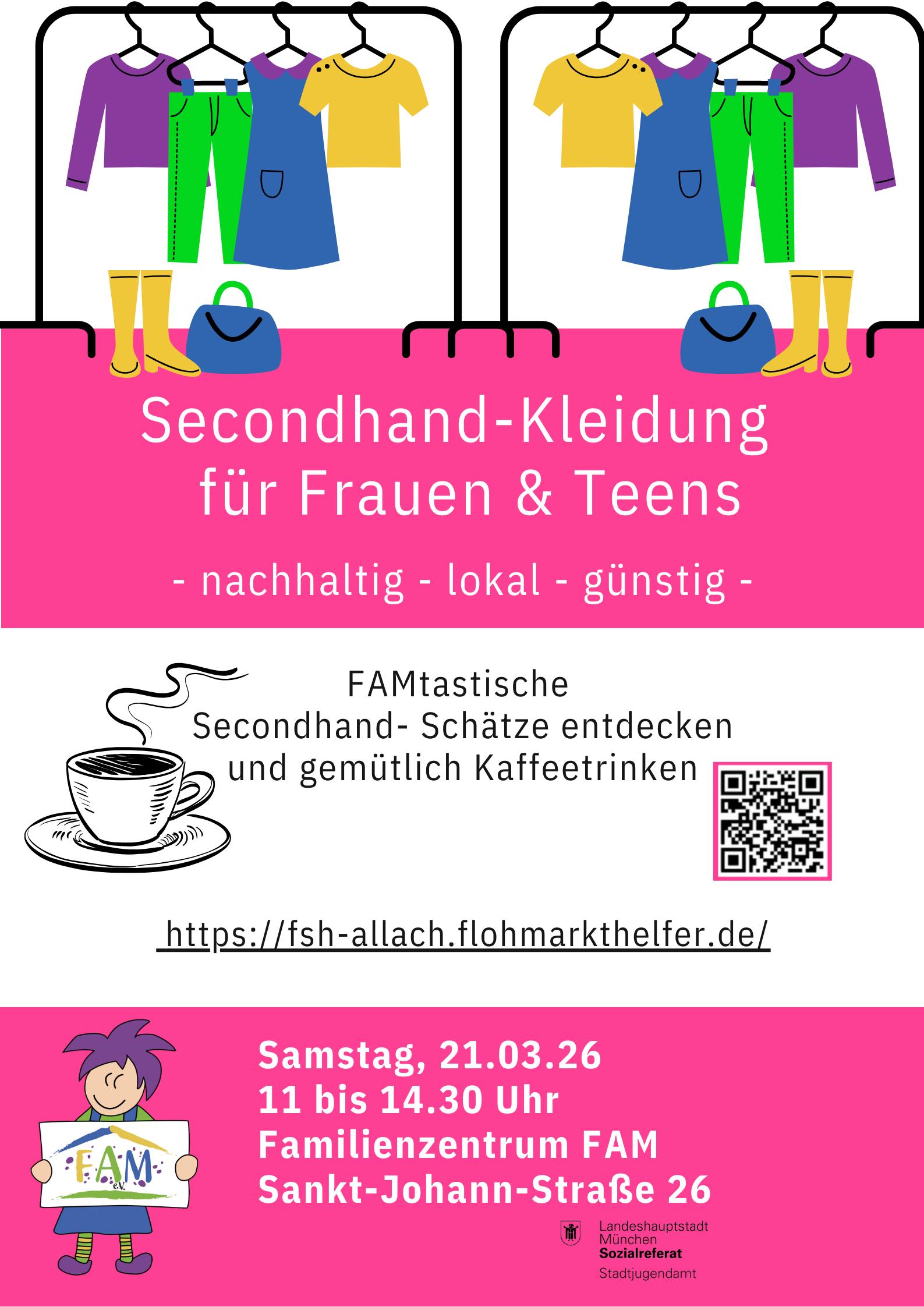 Der Secondhand für Frauen und Teens findet live im FAM statt. Im Vorfeld werden ca. 150 Listen-Nummern vergeben, mit der man 20 Artikel für den Verkauf abgeben kann. Alle Artikel werden vom Basar-Team sortiert, nach Größe, Schuhen, Taschen etc. Am Tag des Basars können die Kundinnen wie in einem Modehaus aussuchen, anprobieren und kaufen. Besonders charmant: Im Café kann frau ihre neuen Sachen bewundern, mit einer Freundin ratschen und sich mit leckeren Snacks stärken. Am Abend holen die Verkäufer*innen ihr Geld für alle verkauften Artikel ab und nehmen die übrigen wieder mit. Auch hier bleiben 20% des Erlöses im FAM.